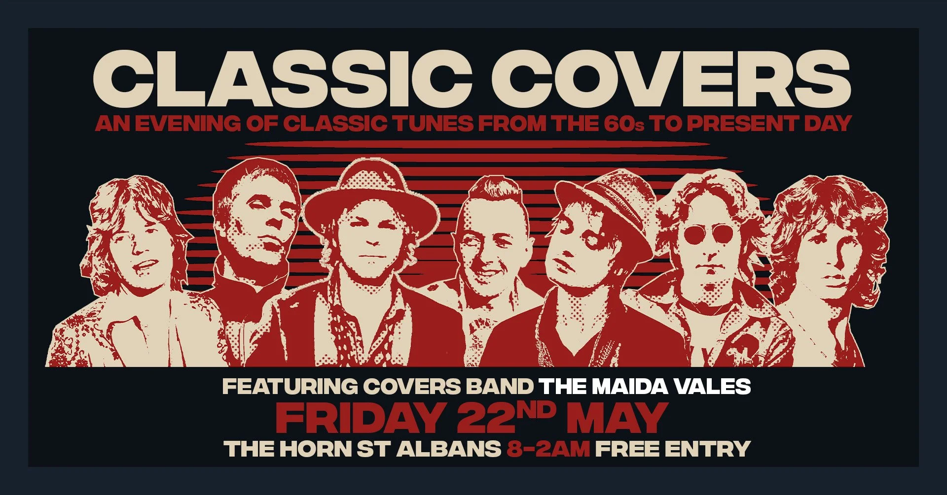Featuring cover band The Maida Vales. The band favor the more eccentric tones and feel good numbers of the early Stones, Kinks and the more recent, Dandy Warhol's, Supergrass and The Raconteurs. The bands keen ear for melody, hooks and groove make for a stand out, whistle blowing, fuzz-rock sound. Exploration into the tremendous highs and the bottomless lows of a middle class music nut living in the heart of the concrete jungle. Love and loss, excess and debauchery together with BIG melodies, raucous riffs, driving bass lines and powerhouse blues beats paired with stage antics to match!